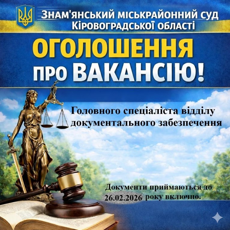 Знам’янський міськрайонний суд Кіровоградської області повідомляє, що станом на 09 лютого 2026 року в суді є 1 вакантна посада державної служби категорії «В» - головний спеціаліст відділу документального забезпечення (строково, до призначення переможця конкурсу або до спливу дванадцятимісячного строку після припинення чи скасування воєнного стану, на період відпустки у зв’язку з вагітністю та пологами основного працівника).
